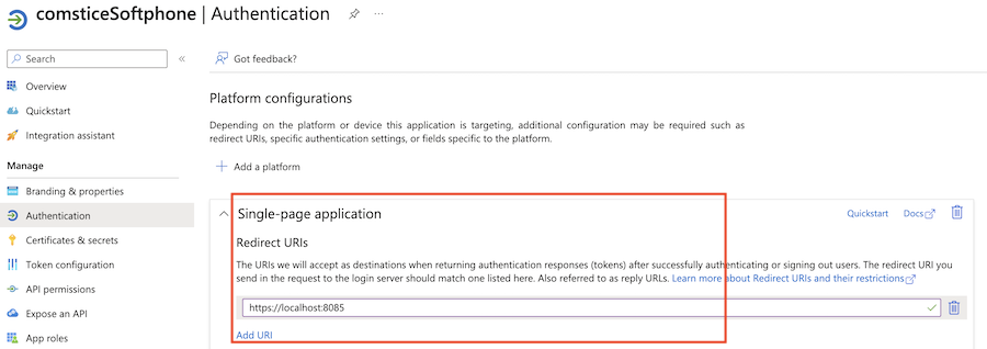 Under Redirect URI Section, add a new SPA URI "https://localhost:8085"