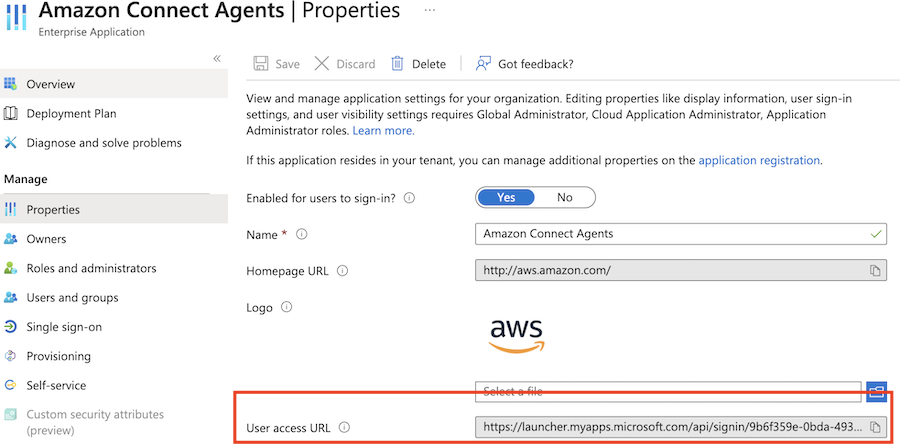 - Go to AzureAD Enterprise Application created for authenticating Amazon Connect agents. Under Overview section, copy "User Access URL" value.