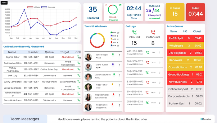 - Agent Dashboard: Comstice also offers Agent Dashboard to call center agents to see the real-time activity, shift schedule, daily performance and the states of the team members inside Salesforce pages.