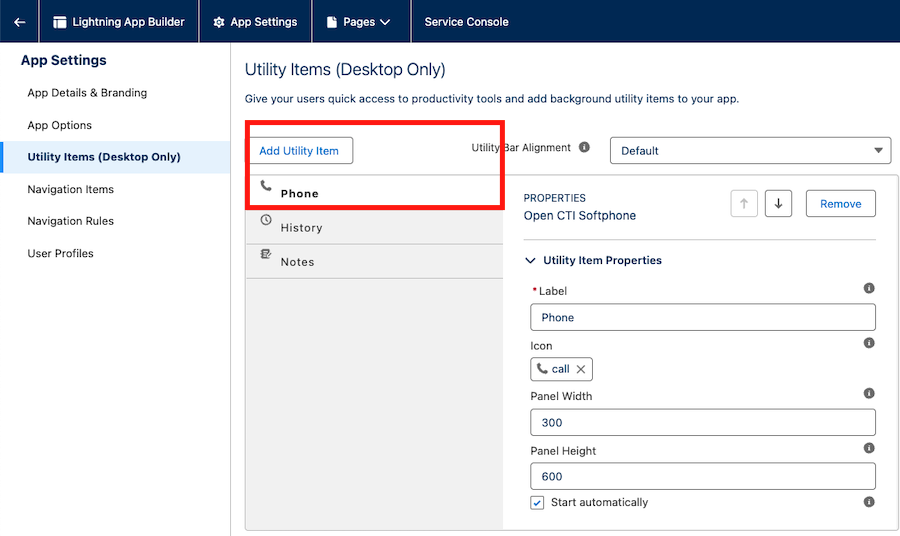 - Utility Items: Add Open CTI Phone item as a new tab. Click here to request a weblink for a demo webphone and test scenario.